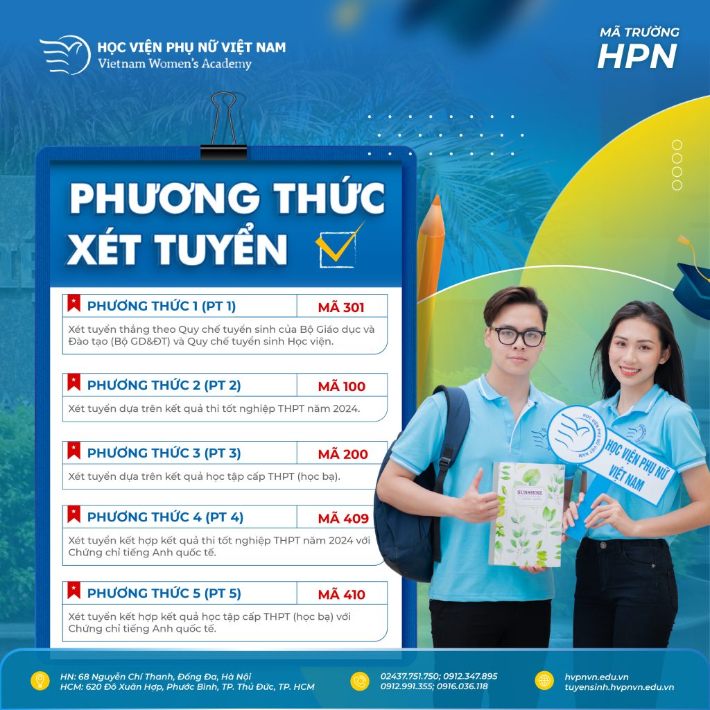 Học viện Phụ nữ Việt Nam giữ ổn định 5 phương thức tuyển sinh, gồm xét tuyển thẳng theo quy chế của Bộ Giáo dục và Đào tạo; xét điểm thi tốt nghiệp THPT; xét học bạ; xét tuyển kết hợp chứng chỉ tiếng Anh quốc tế với điểm thi tốt nghiệp THPT; xét tuyển kết hợp chứng chỉ tiếng Anh quốc tế với học bạ.